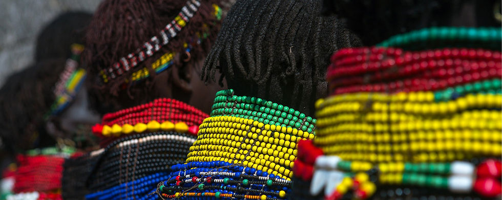 Scarification is practiced by both men and women in the tribe. The women do it to beautify themselves and the men to signify a kill. Both sexes wear a lot of multicolored necklaces and may also have a lower lip plug.